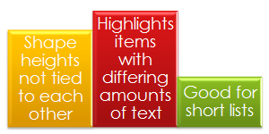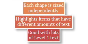 Bar List Use for emphasizing items of different weights. Good for smaller amounts of text or shorter lists. The height of each shape is independently determined based on its text. | |