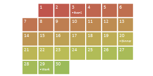 Calendar Dots Use for showing a simple calendar of events, with emphasis on the date. Level 1 text is the date and Level 2 text represents the associated event. | |
