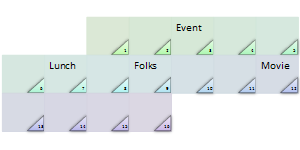 Calendar with Triangles Use for showing a simple calendar of events, with emphasis on the date. Level 1 text is the date and Level 2 text represents the associated event. |