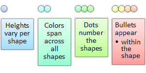 List Dots Use for displaying an ordered sequence. Good for smaller amounts of text or shorter lists. The height of each shape is independently determined based on its text. | |