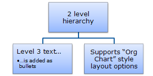2 Level Hierarchy Use to show hierarchical relationships progressing from top to bottom. Good when you want to emphasize two levels of the hierarchy. Supports Organization Chart options for changing layout. | |