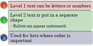Numbered List Use for numbering or lettering a sequence. Level 1 text should be a short number or letter. Works well with large amounts of Level 2 text. | |